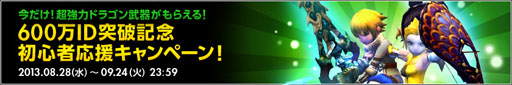 ドラゴンネストは皆様のご声援を受け、遂に登録アカウント数600万IDを突破いたしました!今回は、まだドラゴンネストを遊んだことがないお客様にもぜひ体験していただきたいという想いから、ゲーム内で使用できる超強力な「ドラゴン武器」をプレゼントいたします。キャラクターを育成して、その威力と効果を肌で感じてください。