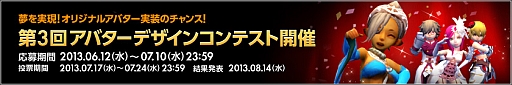 アバターデザインを公募し、選考の上ゲーム内に実装するイベント「第3 回アバターデザインコンテスト」を開催いたします。受賞者には応募していただいた作品のアバターをプレゼントする他、豪華な賞品もご用意しております。お好きなキャラクターにアナタのデザインしたアバターを着せるチャンスです。みなさまのご参加お待ちしております。